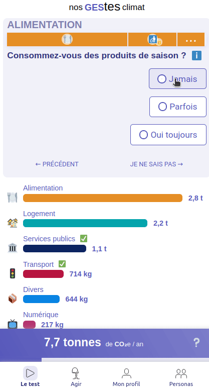 Pour ce faire, nous avons notamment optimisé le graphique de répartition de l'empreinte, en intégrant les textes dans les barres. Il a aussi été animé, ce qui facilite grandement la compréhension de l'impact des choix dans la saisie.